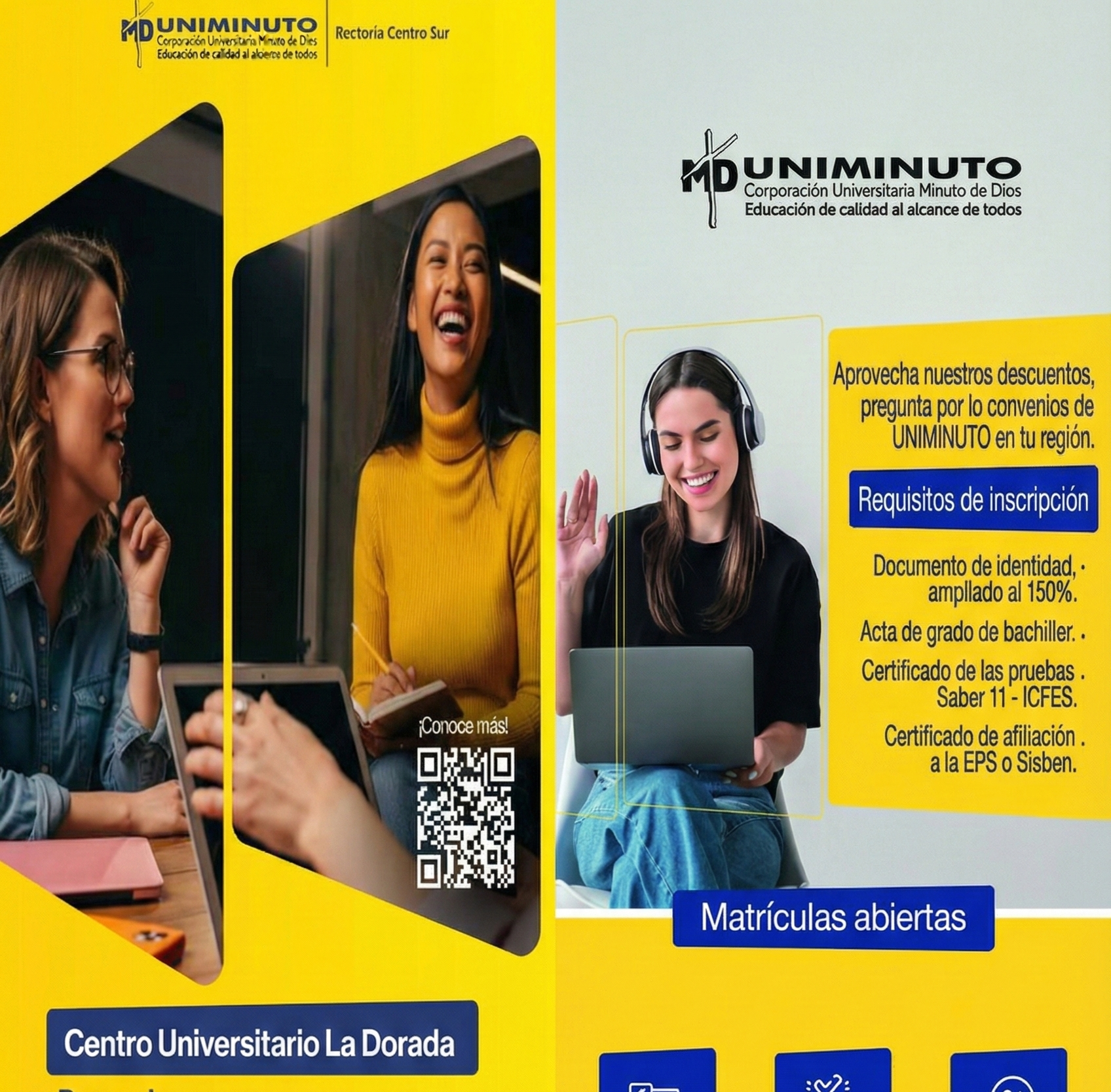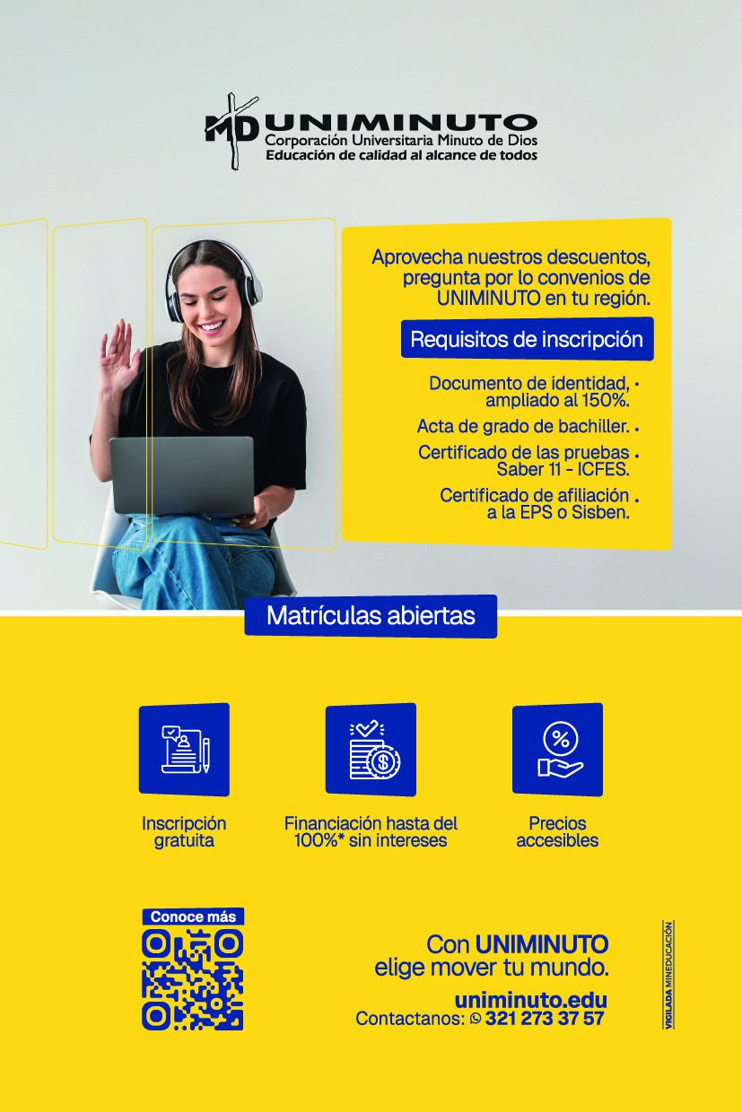 La Corporación Universitaria Minuto de Dios, con presencia consolidada en nuestro municipio, invita a todos aquellos interesados en iniciar su formación profesional a aprovechar sus facilidades de acceso, modalidades flexibles y beneficios económicos para este nuevo periodo de matrículas.